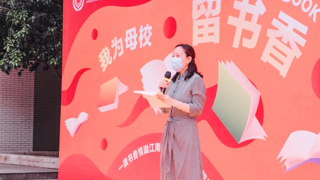 程捷音致开幕词。她介绍了活动开展背景、特色亮点,包括在活动形式上策划了“捐”“领”双线同步开展,在活动内容上精心设计了“互动留言板”“寄语书签”等环节。她指出,书籍是大学文化的重要载体,也是连接莘莘学子情感的纽带,从而呼吁全体物联学子,“生发爱”,做出行动,奉献爱心,引领美德、风尚和正能量;“接受爱”,学会感恩,在接受图书之后为学长学姐的厚望而坚守,为他们的期待而努力;“传递爱”,坚持向美、向上、向善的价值追求,以拳拳爱心,共绘人人参与、人人享有的书友圈。