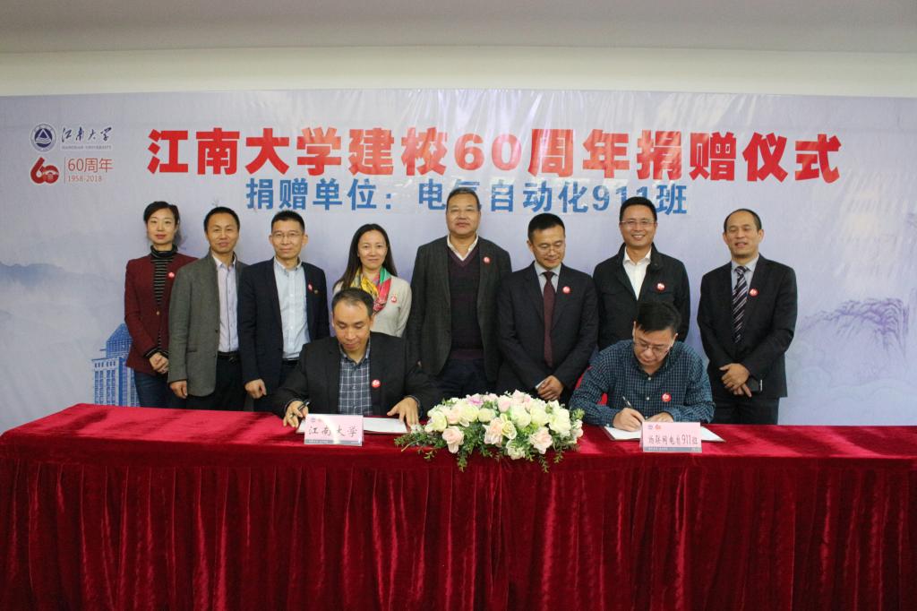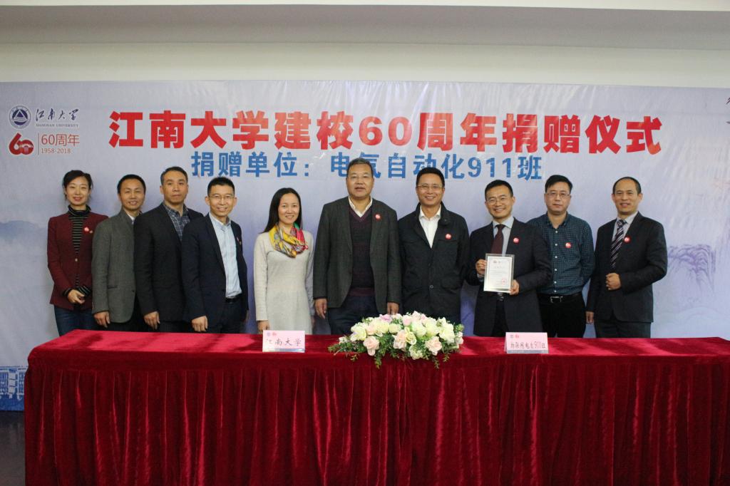 电气自动化911班捐赠仪式在文浩馆105举行。电气自动化911班代表——宁波睿驰塑业有限公司总经理郑成坚、上海祥树欧茂机电设备有限公司总经理赵树才、平安银行平安信用卡中心副总裁俞如忠;93级校友代表、上海锡明光电有限公司总经理王振宇,以及91直播