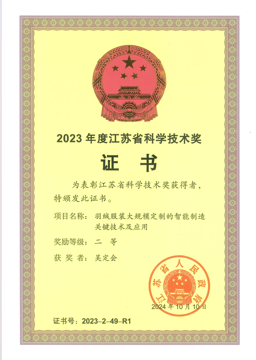 吴定会教授牵头完成的“羽绒服装大规模定制的智能制造关键技术及应用”项目荣获江苏省科学技术奖二等奖。