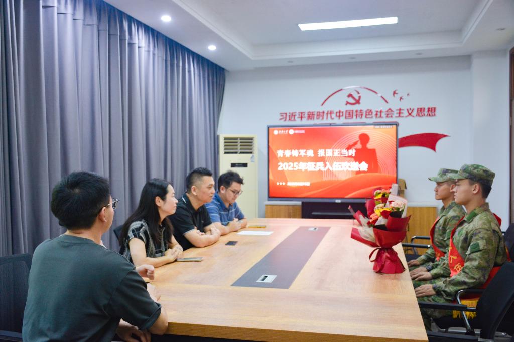 2025年秋季入伍新兵欢送会于学院D112举行,学院党委书记张华、党委副书记吴妍出席会议,入伍学生辅导员张圆、曾磊,国防教育专项辅导员沈滔及全体入伍新兵共同参加。