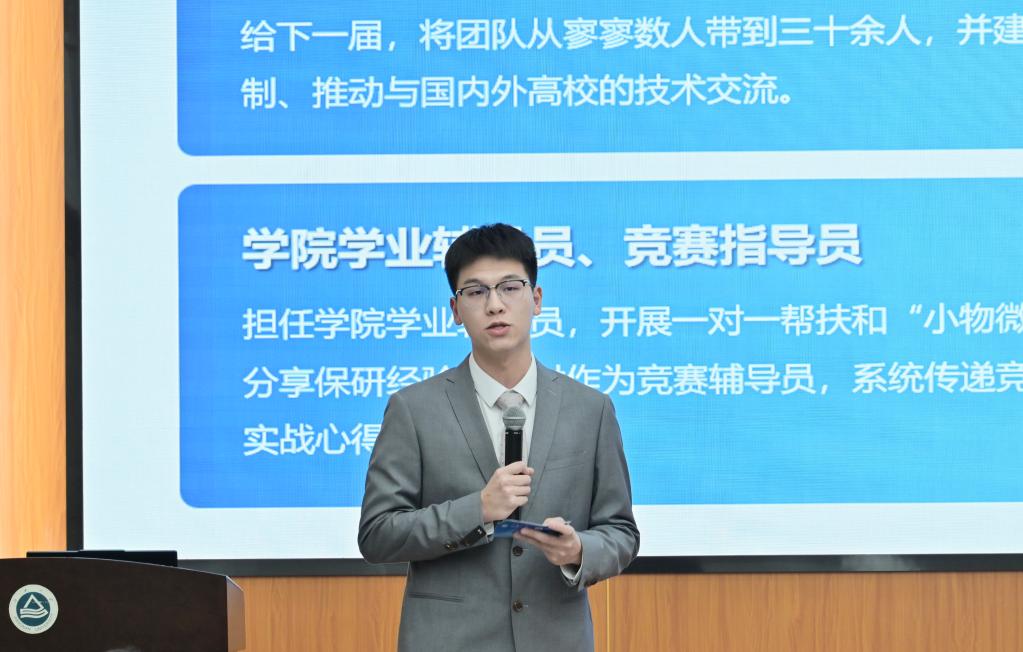 随后,参赛选手们按照抽签顺序依次上台展示。本次评选有学习类、励志类、实践类、文体类、科创类五大赛道,18位选手以精心打磨的PPT为载体,分享了在专业学习、日常生活、实践历练中的珍贵感悟与丰硕成果,用真切动人的成长叙事,传递出执着追梦、不断超越自我的奋进信念与青春智慧。他们之中,有深耕科研领域的科创达人——在实验攻坚中突破技术瓶颈,用创新思维解锁科研难题,在科技探索的道路上稳步前行;有笃志勤学的求知者——深耕专业赛道、夯实学识根基,以持之以恒的积累持续精进自我;有怀揣热忱的励志先锋——不惧成长路上的风雨坎坷,以坚韧意志突破困境、奋勇争先,用拼搏姿态诠释青春担当;有扎根实践一线的践行者——将理论知识融入实践探索,在基层历练中奉献力量,用实干书写青春答卷;更有闪耀文体舞台的追光者——在运动赛场挥洒汗水、奋勇争先,在文艺天地绽放光彩、传递美好。各位候选人各展所长、亮点纷呈,持续点燃现场热烈氛围。
