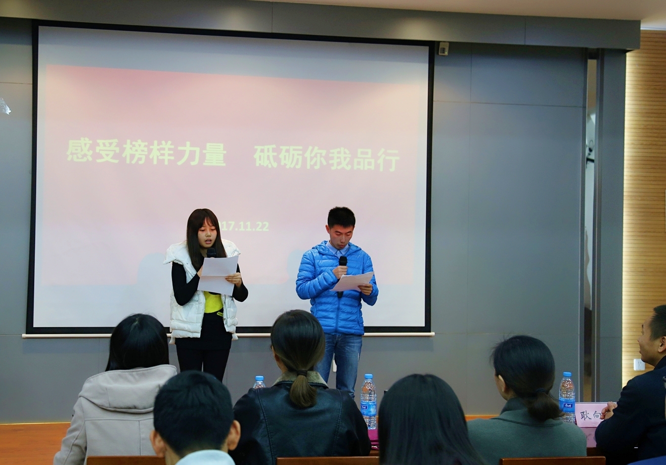 第34期发展对象培训班之“感受榜样力量 砥砺你我品行”道德大讲堂在学院B310举行。物联网学院党委书记程捷音老师,物联网学院党委副书记、副院长耿向阳老师,辅导员赵丽敏老师出席活动,第34期分党校培训学员齐聚一堂,共同感受榜样力量。