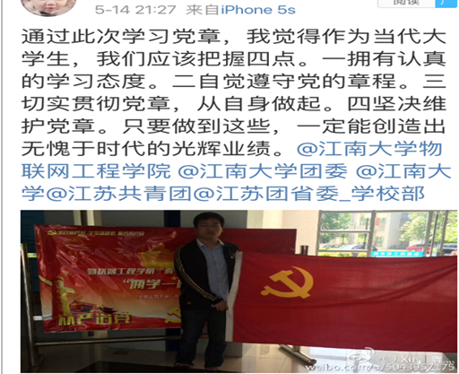 在“分享党章合影,争做合格党员”暨“胶片中说不尽的党章”党日活动中,为创新活动形式,提高学习效果,号召全体党员与党章合照,将照片做成展板、视频集,以传递好形象,浓厚红色氛围;同时采用线上、线下相结合的方式,线上利用新媒体平台,将自己对党章的理解、“两学一做”的正能量思考在微信、微博上推送,在学院微信公众平台“IOT时代”上发起点赞评比活动,线下踊跃参与专题讲座、道德讲堂等活动,热烈讨论所悟所思,以形成常态发布学习资料、常态交流学习经验、常态争先创优的常态化局面。