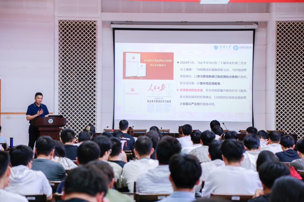 张华以《坚持把纪律挺在前面,奏响新时代奋进路上的“物联最强音”》为题,从“严守纪律底线”“筑牢思想防线”“激发建功立业”三个方面为毕业生带来了一堂生动精彩的党课。他以史为鉴、以事为例,结合社会热点、学院发展、学生生活展开生动讲述,引导同学们坚定不移听党话、跟党走,以实际行动坚定拥护“两个确立”、坚决做到“两个维护”,努力做自我革命的表率、踏实奋斗的标杆,争做新时代新征程的逆行者、奋斗者和深耕者。同时,他希望毕业生党员在文明离校时争做表率、在工作岗位上戮力担当、在深造学习中勤奋钻研,为新质生产力发展和科技强国建设贡献物联学子的时代力量。
