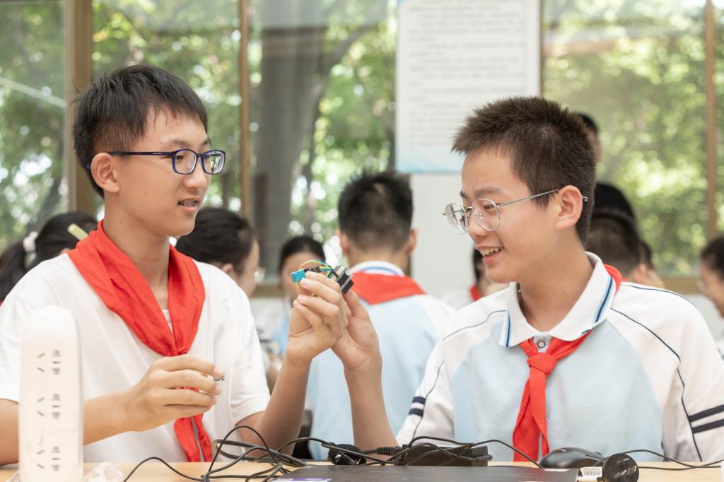 在2023年全国大学生智能汽车竞赛上斩获全国一等奖的陈基浩、张海涛、胡宸恺同学也来到了格致中学,为学生们介绍了自主研发的独轮车、越野单车和城市水道清障机器人的外观设计、工作原理等。在看到智能车可以轻松实现自立、转向、避障等目标功能后,学生们在赞叹科技神奇的同时,更加坚定了向榜样学习、未来投身科研的信心和决心。
