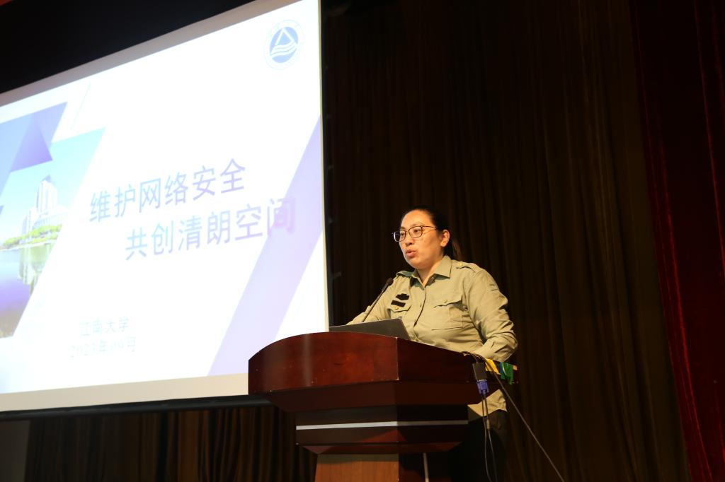孔丽丹首先对2023级新同学表达了热烈的欢迎和祝贺,并作“维护网络安全,共创晴朗空间”主题讲座。她从网络安全相关法律法规入手,告诫学生互联网不是法外之地、互联网不是虚拟空间;以真实案例为警示,强调维护校园网络安全和网络文明的重要性;以91直播