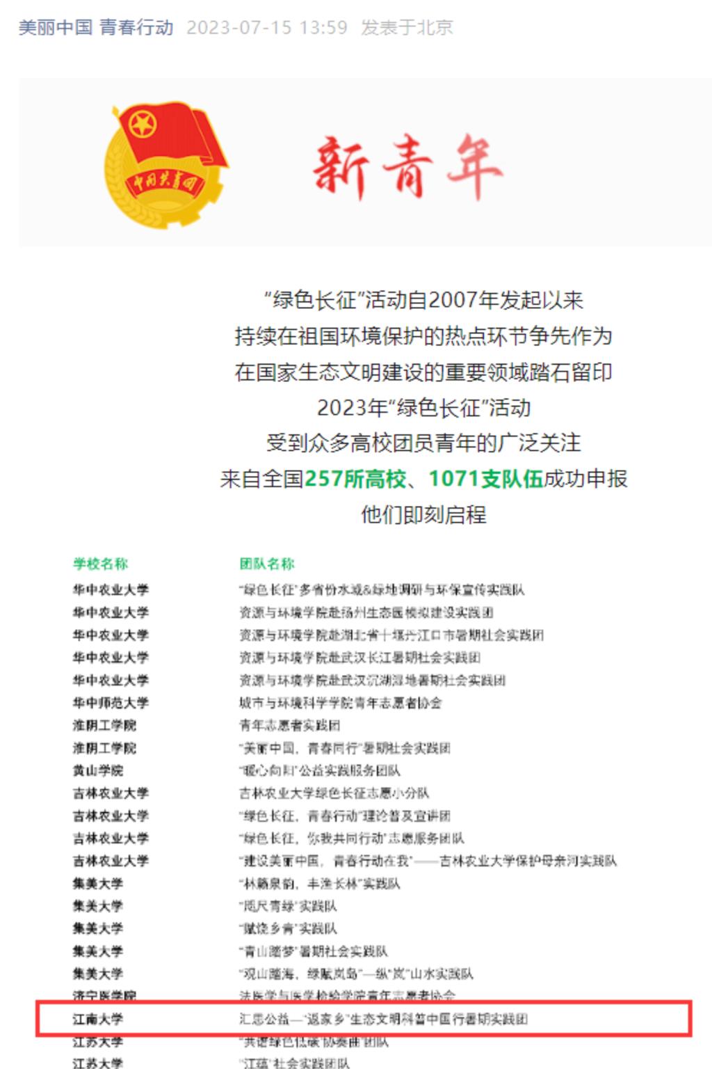 汇思公益团组建的“汇思公益——返家乡生态文明科普中国行暑期实践团”成功入选2023年乡村振兴“笃行计划”专项行动全国示范性团队和“美丽中国·青春行动”2023年青少年绿色长征科考实践活动,两个专项活动均为91直播