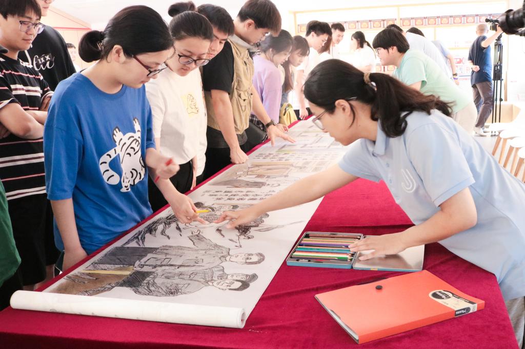 十米长卷由三部分组成,分别以瞿秋白、张太雷、恽代英三个纪念馆作为开篇线索,依次复刻了瞿秋白英勇就义、张太雷主持教导团誓师起义、恽代英创办利群书社等历史事件,同时呈现了“常州三杰”的革命箴言、诗文遗作。流畅的线条、生动的表情、雄浑的笔墨,展示了先辈们高尚的革命情操和崇高的人格情怀。画笔轻轻,却描绘出了历史的厚重感和凝练感,更流露出知党、敬党、爱党、诵党的真实情感。活动当天,实践团成员在“常州三杰”纪念馆完成了作品的最后上色,用十米画卷为“七一”献上了一份别出心裁的礼物,以特有的方式与三位百年前的“95后”展开一场跨越时空的信仰对话,敬先烈、忆初心、担使命。