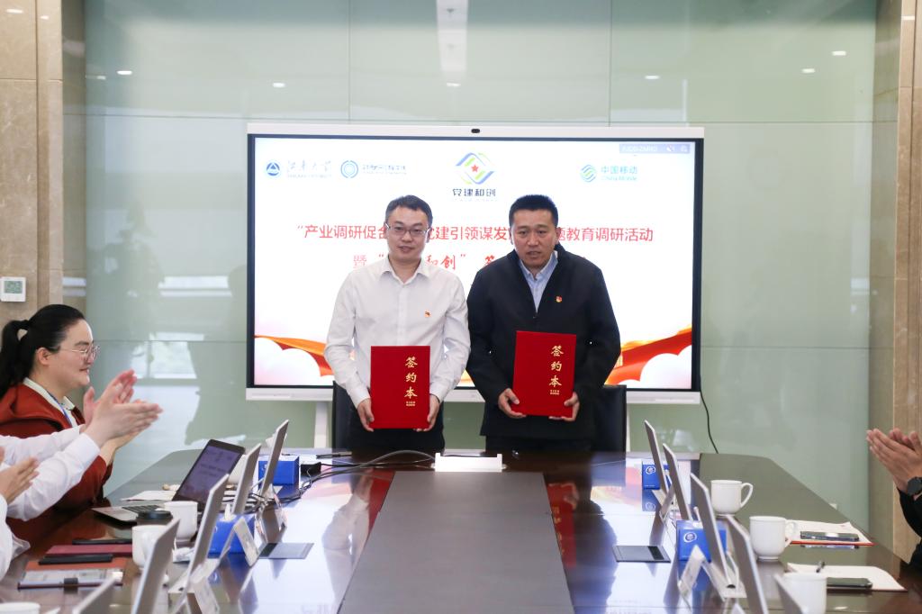 办公室党支部书记安君、中国移动无锡公司滨湖营销中心党支部书记刘炜分别作为院企双方代表,在支部党员的见证下,签订“党建和创”主题实践共建协议。