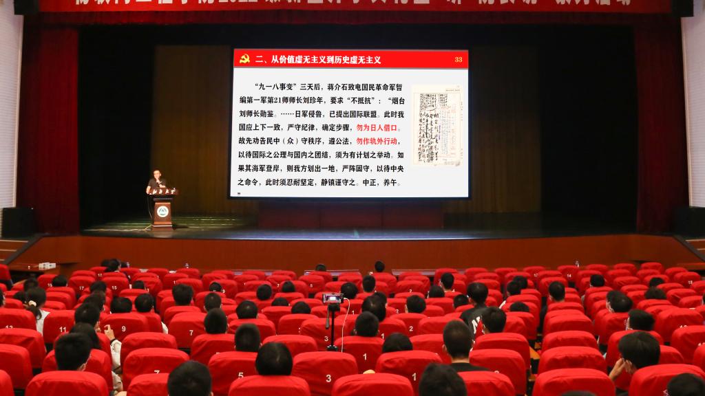唐忠宝首先讲述了虚无主义和价值虚无主义的由来。接着,他重点剖析了历史虚无主义的表现、实质和危害。他指出,在各种错误社会思潮中,历史虚无主义尤为值得关注。历史虚无主义否定人类发展规律,以假设推断代替历史事实,用今天的标准来衡量历史事件,披着学术的外衣谋求政治诉求,利用文学艺术否定传统文化和红色文化,集中攻击党的重大事件和领袖人物,利用互联网等先进手段碎片化历史等,是一种思想意识形态鸦片。随后,他通过剖析一系列历史虚无主义表现的实际案例,阐述了历史虚无主义思想的不轨主张和背后隐藏的政治图谋,指出了历史虚无主义在网络和现实生活中造成的极大危害。