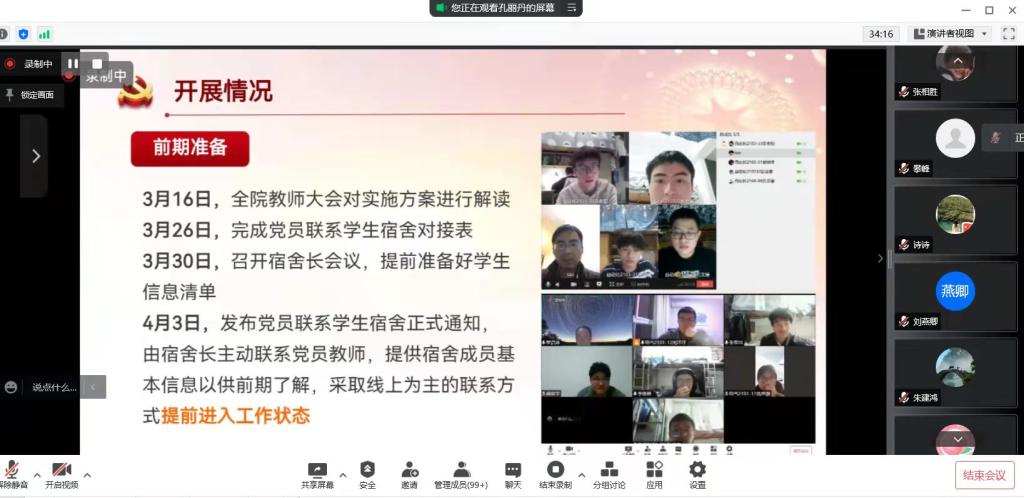 孔丽丹就上月16日学院召开党员教职工联系学生宿舍动员会后的推进情况进行介绍。她进一步明确七大工作职责,梳理推进落实措施,对教师党员中已开展的工作案例进行分享,并反馈了部分学生宿舍的对接感想。通过线上交流,进一步引导广大党员教职工,思想上以学生为本、拉近师生距离,积极发挥自身在教书育人、管理育人、服务育人中的先锋模范作用;行动上回应学生关切、送上关心问候、献上爱心嘱托,切实做好对我院学生的关怀帮扶。