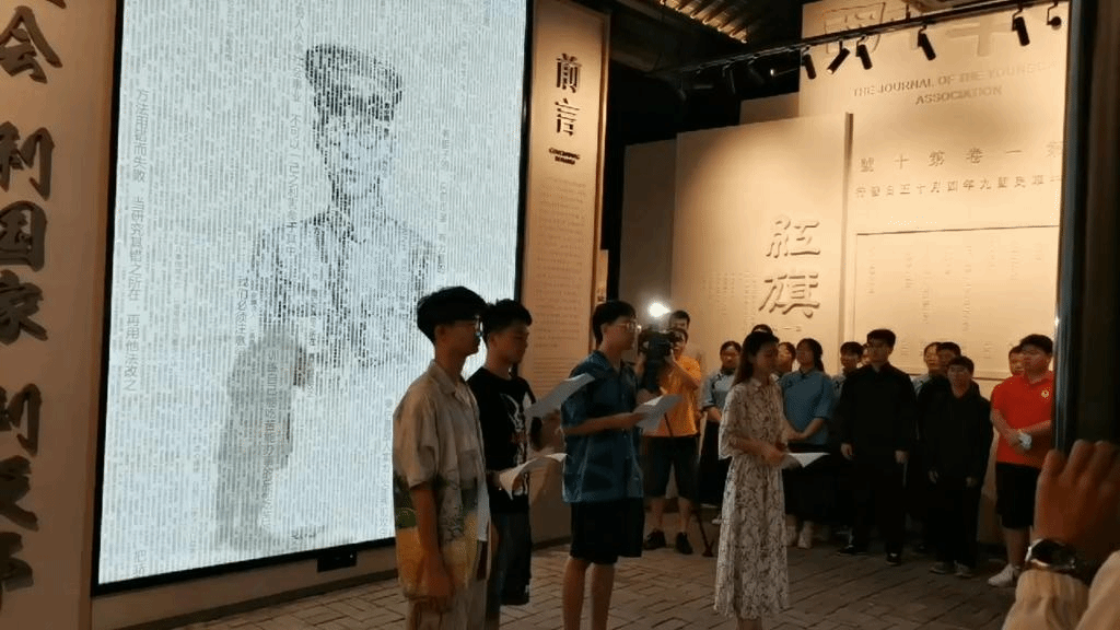 无独有偶,就在志愿团服务期间,来自华中师范大学“恽代英宣讲团”也来到的纪念馆开展暑期实践活动。同样是以革命人物作为精神引领的青年组织,大家的相遇一下子就找到了共鸣点,于是一场围绕“常州三杰的青年精神与信仰”为主题的文艺宣传活动,在两校青年的联合下,迅速策划起来。将三杰事迹、新时代青年精神、党史、及建党百年“七一”重要讲话精神等元素结合起来,用话剧、快闪、朗诵、演讲等方式来展现,一场文艺展演活动在纪念馆开场,面向来馆参观的群众展演。活动还吸引了常州电视台的采访,让活动的影响力也进一步扩大。