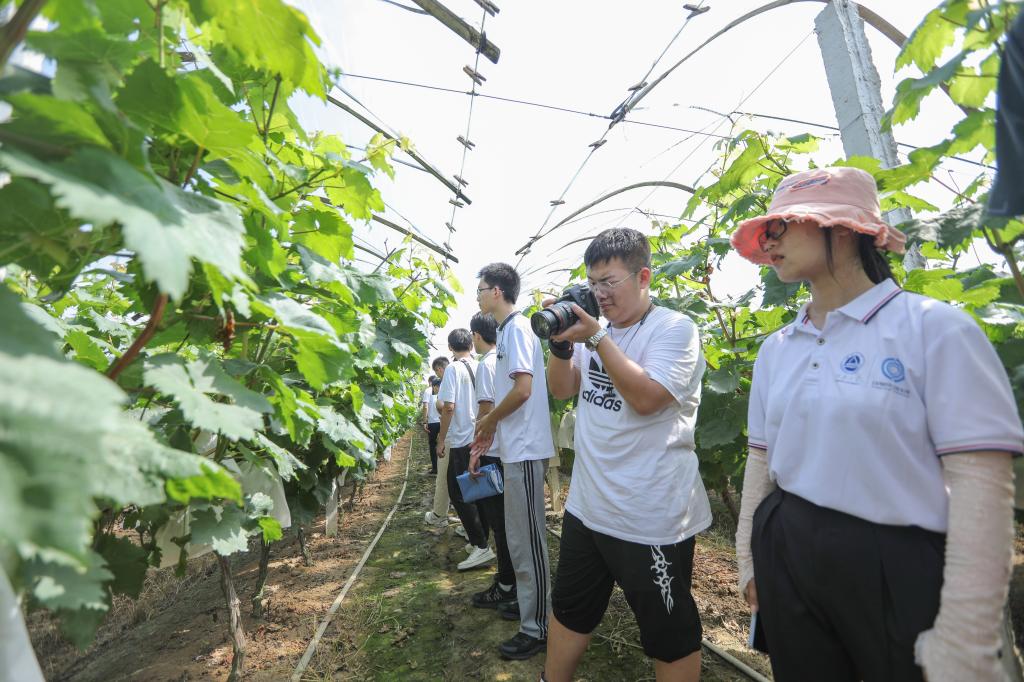 在白塔村集体农业合作社的瓜果采摘园里,桃子、橘子、葡萄等绿荫浓浓,即使天气炎热,很多种植户仍在园子里辛勤劳作,让实践团的成员目睹农民劳作辛苦的同时,也让大家真切感到,只有大力发展智慧农业,才能彻底改变生产方式,让苦力活减少和产值提高,才能让乡村更加振兴。