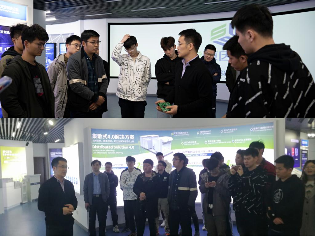 随后,在总工刘金明的带领下,师生党员们参观了研发中心,了解了光伏逆变器、储能系统、电能质量等重点案例。通过工作人员的详细讲解,学生党员全面认识了研发中心的运行模式和协同工作的重要环节。过程中,同学们对开发细节提出了询问,刘工耐心地从专业角度为大家答疑解惑。对新设备、新技术、新发展发出赞叹的同时,同学们也对上能电气注重细节、考虑周全、保障有力,努力打造优质服务的精神所深深打动。
