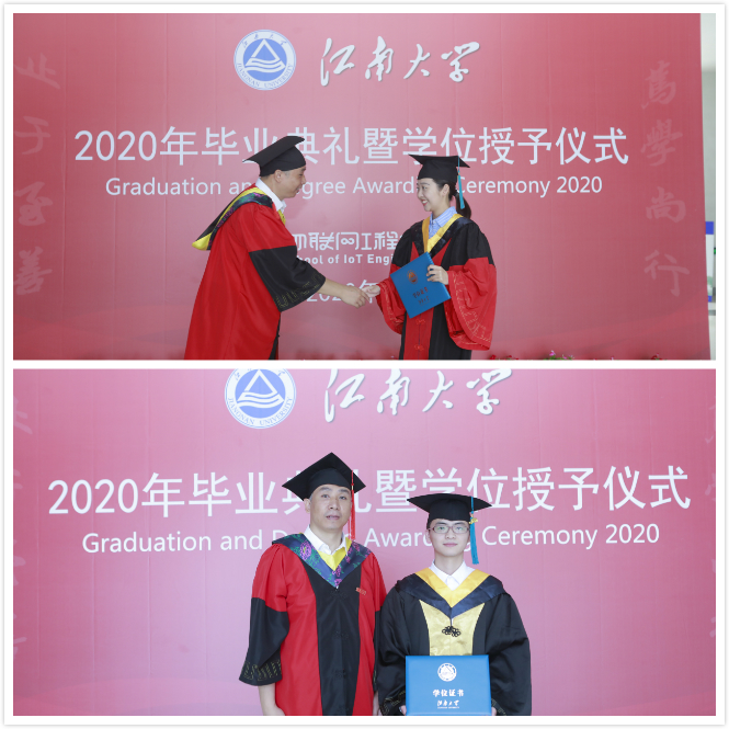 2020年是不平凡的一年,2020届毕业季是不平凡的毕业季。全体毕业生度过了有史以来最漫长的寒假,全力支持和配合学校和学院的各项安排,克服了线上教学、线上招聘、线上答辩等诸多考验。为了给物联学子的求学生涯划上一个阶段性的圆满句号,学院排除万难、精心筹备本次典礼及仪式活动,还通过横幅、毕业背景墙、纪念礼物、毕业视频等,进一步增强毕业生对院校的认同感。希望全体物联毕业生们能够在社会奉献中成长蜕变,在追求卓越中发扬物联荣光,传递好江南声音、讲述好江南故事,用坚韧不拔的初心、蓬勃迸发的勇气、昂扬饱满的激情在实现伟大复兴“中国梦”的实践中贡献青春力量。