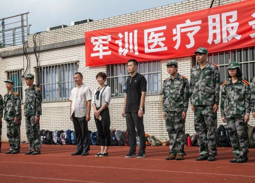党委书记程捷音,党委副书记、副院长耿向阳,分团委书记吴垚与我校人民武装部老师韦红武一同前往西北操场,慰问2019级全体军训学生。活动由2019级带训辅导员李猛主持。