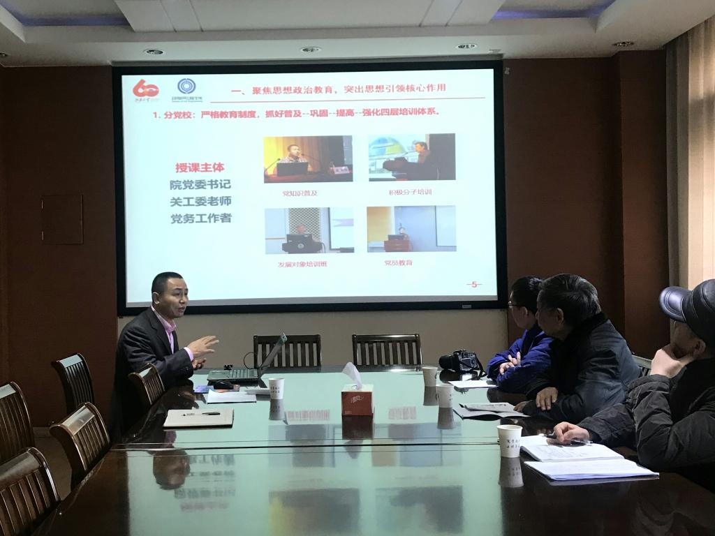 耿向阳首先对娄书记一行的到来表示热烈的欢迎,同时向关心学院品牌建设工作的关工委老师表达了感谢。随后,耿书记作了题为“凝心聚力树党建品牌,老少携手促学院发展”的关工委品牌建设工作汇报,他从“聚焦思想政治教育,突出思想引领核心作用”,“聚焦基层组织建设,强化基层支部示范效应”,“聚焦党建质量提升,夯实党建育人工作品牌”三方面展开。 学院依托分党校、分团校、唯实讲坛、创e讲堂和思政课五个阵地来突出思想引领的核心作用。通过严守党员进入关口、严格党员教育制度、严肃党内组织生活和严肃执行党建述职评议来强化基层支部的示范效应。通过强化仪式教育、讲好道德故事和强化示范作用来提升党建质量,通过建设学院在学生党建、支部建设和学生个体层面都取得了不错的成绩。