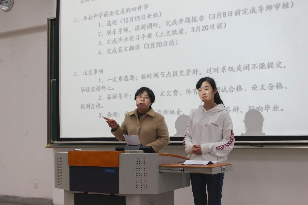 大会伊始,吴垚与何倩楠上台致辞,向到场的15级物联学子们介绍本次大会的目的,随后邀请朱志芳上台详细介绍2019届本科生毕业设计(论文)工作的内容与各时间节点需完成的任务。