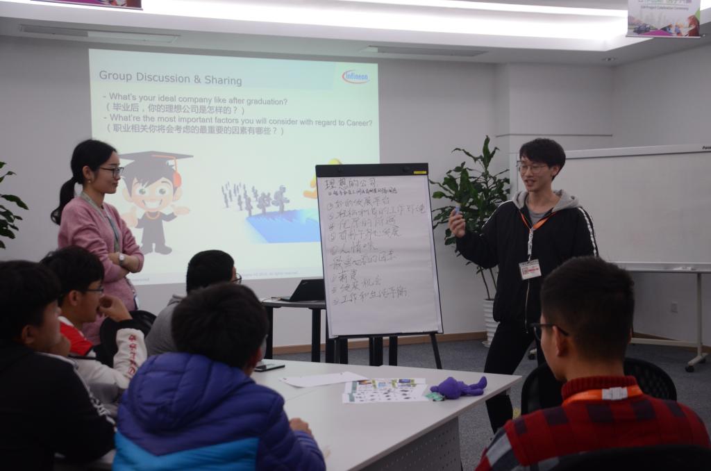 全体参观人员于下午1:30到达英飞凌科技(无锡)有限公司,由人力资源部专员朱玉兰女士接待营员到会议室,详细地为营员们介绍了其以质量为先导的91直播,承诺、合作、创新、行动的企业价值观以及公司在半导体行业的地位与优势和对于不同产品多样的封装形式与测试流程。公司还特别安排了校友面对面交流分享会和交流互动活动,三位毕业于91直播