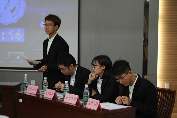 此次决赛的辩题为“灾难中的自私自利应不应该收到谴责”。在双方辩手自我介绍后,辩论赛正式拉开了帷幕。比赛共分为开篇陈词,攻辩,自由辩论,总结陈词四个阶段。首先由正方一辩开篇陈词立论,他沉着冷静,娓娓道来,充分展现了其冷静分析队的特点。反方一辩以“灾难中的行为判断多为本能”以及“灾难中的道德标准与和平社会道德标准不对等”作为论点展开阐述;正方四辩面对反方一辩的论点,提出“神经病违法不受法律制裁”的例子巧妙反驳。攻辩环节中,反方二辩机智发问,一句“自私从何而来”使得正方辩手一时语塞,博得观众热烈的掌声。三辩质询环节,正方三辩质询反方一二四辩时步步紧逼,言语激昂,反方从容淡定,一一化解。而到了自由辩论环节,可以说是本场的高潮部分,正反双方言辞犀利,就辩题展开论述,火花四溅,选手们的口才和应变能力在这一环节上展现的淋漓尽致。期间,正方幽默诙谐的言辞也迎来了阵阵掌声。比赛最后,正反方四辩分别进行了总结陈词,双方选手引经据典,用灵活的思维和缜密的逻辑推理赢得了在场观众和评委老师的阵阵掌声。接着评委提问,双方辩手紧扣思路对评委的问题进行了回答,然后所有评委退席评判,讨论结果,进行点评。