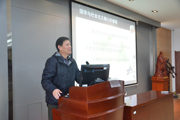 表演过后,程勉中老师为同学们开展了以“国学与社会主义核心价值观”为题的讲座。程老师首先向同学们解读了国学的基本内涵。其次,他指出,国学的传统文化精华是涵养社会主义核心价值观的源泉,例如“自强不息、以和为贵”等思想是“富强、民主、文明、和谐”这一国家层面价值目标的源泉,“仁爱、中正、天下为公”等思想是“自由、平等、公正、法治”这一社会层面价值目标的源泉,“忠、义、诚、信、礼”等思想是“爱国、敬业、诚信、友善”这一公民层面价值目标的源泉。从国学到社会主义核心价值观,不同层次不同内容的“道德遵循”是主要价值追求之一。最后,程勉中老师表示,希望同学们在身心的维度追求“道以养生”,在情感的维度追求“诗以抒情”,在道德的维度追求“儒以涵德”,在智慧的维度追求“慧以净心”,以校训“笃学尚行、止于至善”为引领,培养好德性,坚守好德行,做社会主义核心价值观的践行者。