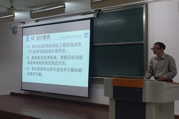 颜文旭老师首先介绍了专业综合设计的现实意义:这是对自动化、电气专业的各项基础课和专业课知识的综合应用,对培养学生的专业知识素质,培养学生综合应用所学知识和专业技能进行工程设计的能力,培养学生解决本专业实际工程问题和创新实践能力具有重要意义。随后颜老师阐述了电气和自动化专业综合设计的要求、内容、进行方式和考核方式。综合设计要求学生参与完成1项自动化工程或电子产品等项目的设计和开发,熟悉相关技术标准以及技术规范的表达方式,学会查阅并运用专业技术手册等。紧接着,颜老师给学生展示了往年综合设计的优秀作品,如3D打印机、智能寻迹小车和自感应水龙头等等,让学生对设计的作品有了一定的概念,增强了综合设计的信心。 最后,颜老师为每个班级分配了三个指导老师,负责班级学生综合设计的指导和考核工作。