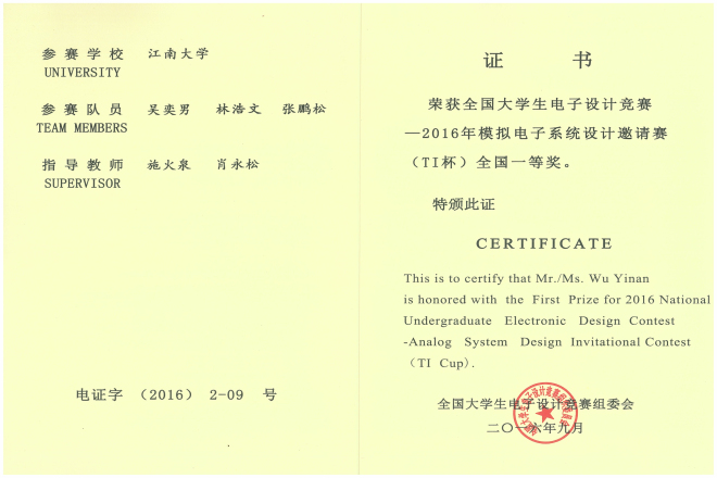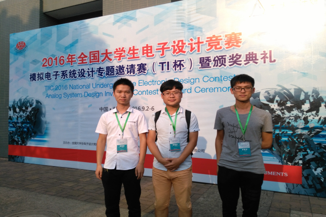 TI杯模拟电子系统设计邀请赛是全国大学生电子设计大赛其中一项十分重要的系列赛事,一直以来是学院重点支持的学科竞赛,今年我院学生在此类赛事中,不断突破,取得了十分优异的成绩。就在暑假期间,学院学生捧得了江苏省电子设计竞赛的TI杯,紧接着又在本项赛事中斩获一等奖,体现了学院近年来对电子设计类竞赛的重点培育成果,同时也是学院不断加强对学生电子设计实践能力培养、及教学培育水平不断提高的表现。相信在本次竞赛取得优异成绩的基础上,学院将进一步加大对电子设计类竞赛的支持力度,使更多学生参与竞赛,并获得更好的成绩。