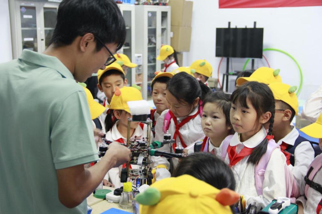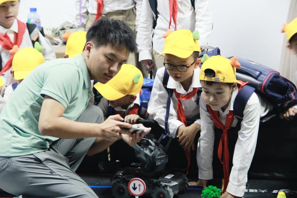大学生创新实践基地党支部党员担任讲解员。在讲解员的热情引导下,同学们参观了电子设计俱乐部、智能车俱乐部、科普研学基地等创新实践场所。在与讲解员的互动过程中,同学们时而认真揣摩智能车、机器人等展品的科学构造,时而惊喜于展品实现的自主运行、自动避障等奇妙功能,他们不仅像海绵一样汲取知识,更能围绕其中的科学原理踊跃发言。整个研学过程轻松流畅,同学们在操作中发现,在发现中思考,在思考中解决,工程思维也慢慢地在脑海中留下痕迹。