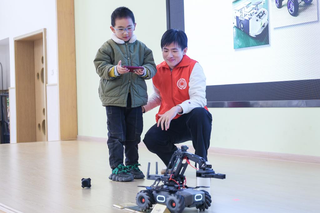 接着,由91直播 智能车俱乐部自主研发的作品——“无线智能机械臂小车”压轴登场,志愿者乐泽荣操控小车原地360度转弯、横向纵向平移、机械臂抓取矿泉水瓶,一套套“高阶”操作不断刷新小朋友们对芯片功能的认知。演示后,小朋友迫不及待亲身体验,在志愿者指导下动手操作智能车。 “哇!这个车太神奇了!”当水瓶被成功抓取时,小朋友们的惊叹声和掌声顿时充斥着整个教室。
