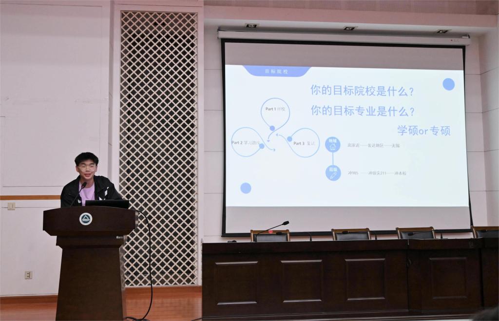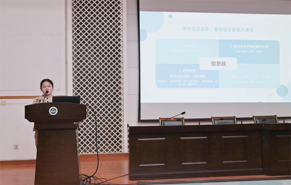 随后,王子木结合自身考研经历做经验分享。她介绍了择校、备考阶段的心路历程和有效做法,并将自己成功上岸后总结的有关“考研目标确立”“考研信息获取”“复习时间规划”“考研压力调试”等方面的心得体会分享给与会同学。她指出,考研不仅是一场知识的较量,更是一场心态和毅力的考验,因此,同学们在备考过程多专注自身的进步,保持积极乐观的心态,无论结果如何,奋力一搏便不留遗憾。
