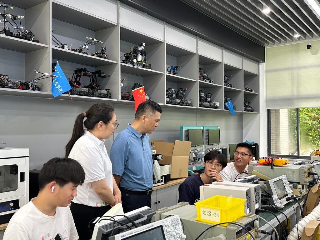 在大学生创新实践基地,张华一行走访了电子设计、机器人、智能车、电力电子等科创俱乐部,与竞赛指导老师、备赛学生深入交流,现场观摩了电子设计竞赛校内模拟赛。张华对暑期坚守在一线的指导老师表示感谢,对全力备赛的同学们给予高度评价,他表示学院将努力做好赛前指导、设施保障和后勤服务工作,希望同学们能够在有限的备赛时间里夯实理论知识,提高实践能力,提升综合素质,以扎实的专业素养在比赛中取得优异成绩。