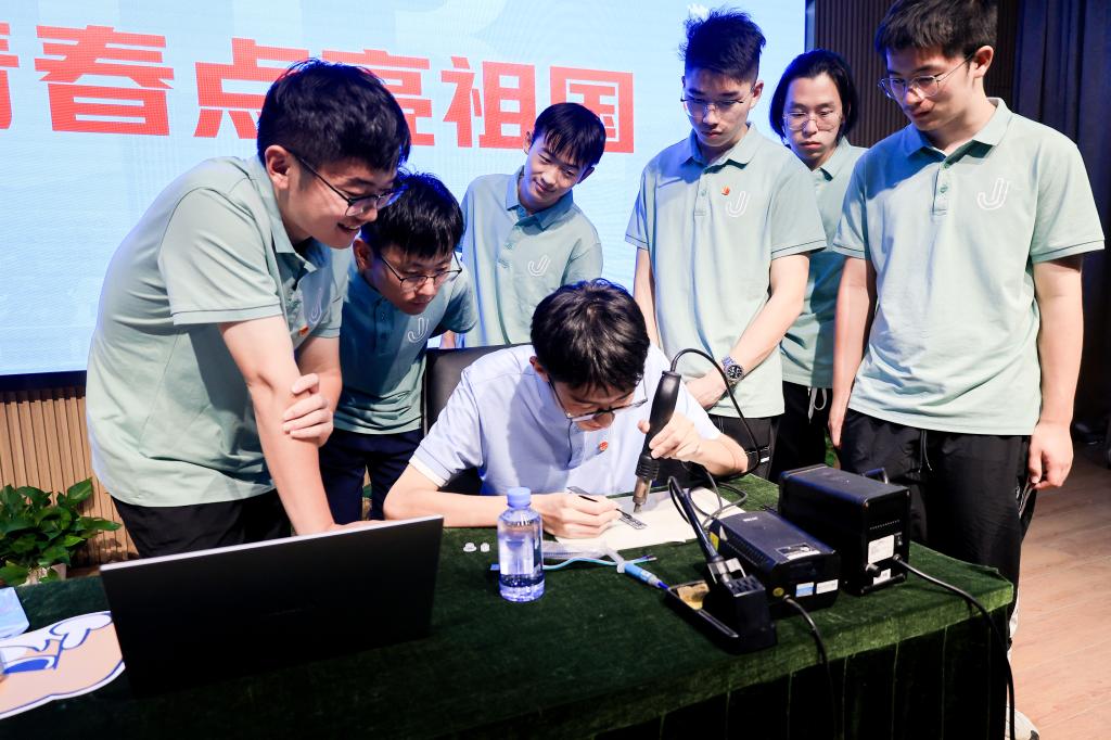 秀专业技能,共庆祖国华诞。发展新质生产力,科技创新是核心,青年的力量显得尤为重要。值此新中国成立七十五周年之际,同学们用专业技能呈现了一场别开生面的“青春点亮祖国”仪式。同学们现场动手实践,焊接一块块电路板,将其拼接成灯牌,随着学生代表挥动电路板灯牌,“欢度国庆”“我爱你,中国”等国庆祝福语在空中显现。灯光与梦想交相辉映,青春与祖国同频共振,这不仅是一场技术与艺术的完美融合,更是物联青年对祖国深情告白的生动体现。