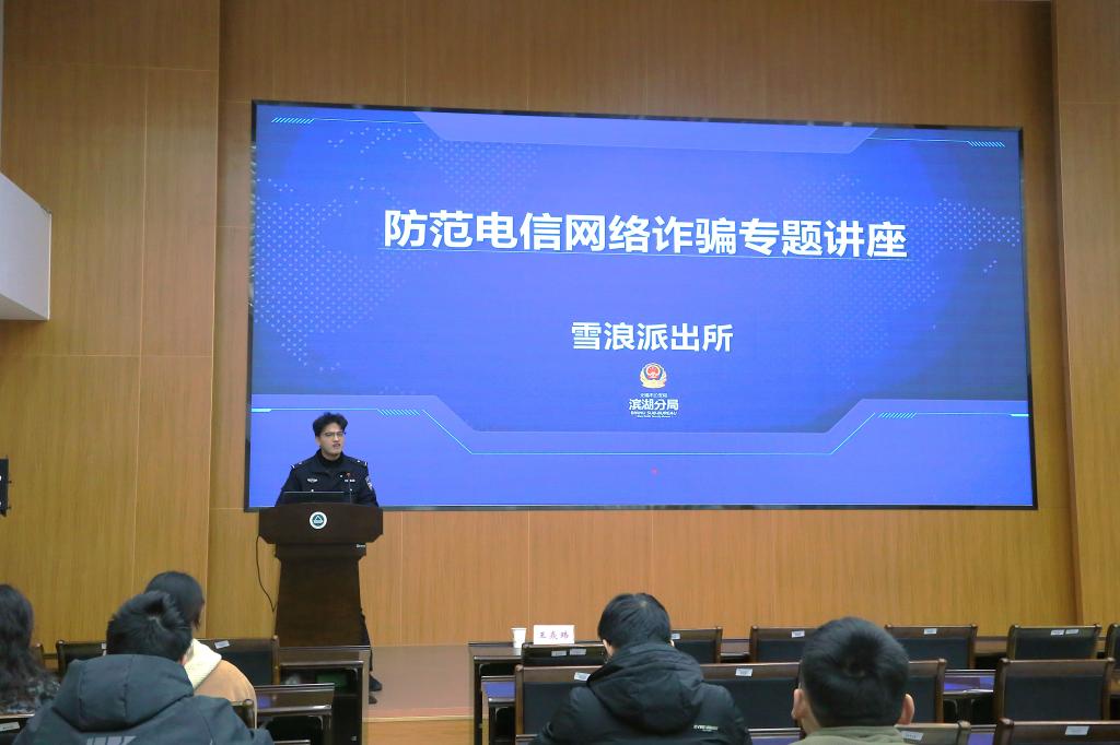 3月14日下午,为进一步增强同学们的反诈防骗和消费维权意识,学院联合无锡市滨湖区雪浪派出所在D328会议室举办“筑牢反诈防线,共护消费权益”校园安全专题讲座。滨湖区雪浪派出所王焱玮警官应邀主讲,150余名师生现场参与。