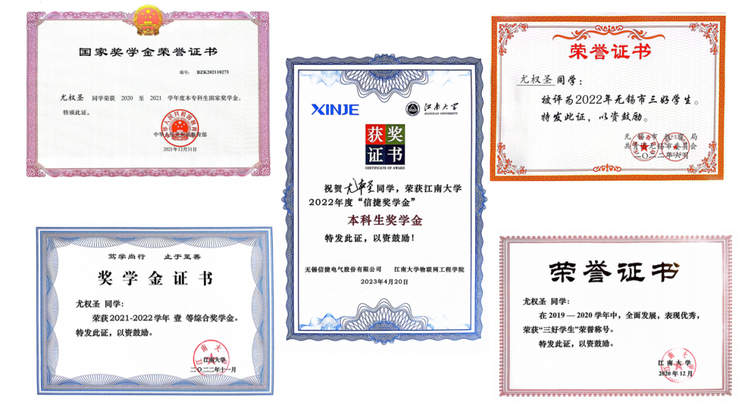 持之以恒地学习为他带来了成绩上的长足进步。在大学三年里,他的专业排名从第23到第11,再从第6到第2,进步是他的主旋律。“日拱一卒,功不唐捐”,综合测评第一、国家奖学金、一等综合奖学金、无锡市三好学生是他努力的证明。