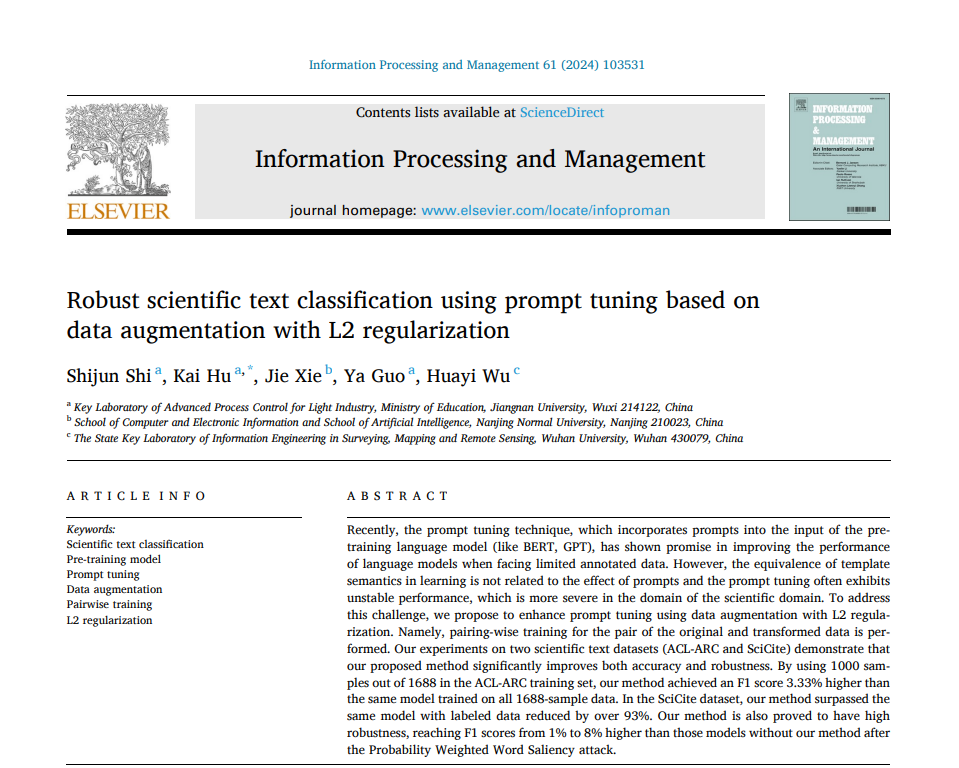 2020级本科生时世骏以第一作者身份在《Information Processing & Management(IP&M)》(中科院一区,IF=8.6)发表题为“Robust scientific text classification using prompt tuning based on data augmentation with L2 regularization”的学术论文,该期刊是Elsevier出版社旗下信息科学领域的权威期刊之一。91直播