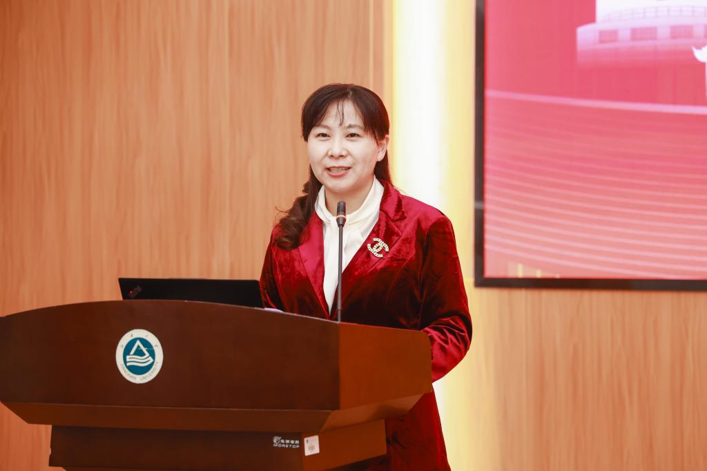 栾小丽介绍学院情况,她从学院目前情况、服务社会、未来合作三个方面向校友们详细汇报了学院建设与发展情况。她欢迎校友们常回来看看,学院的发展建设离不开校友的支持,校友的发展也需要学院的帮助。希望学院和校友之间紧密联系,构建多元化资源共享机制,打造常态化校企合作模式,共同发展,共同进步。